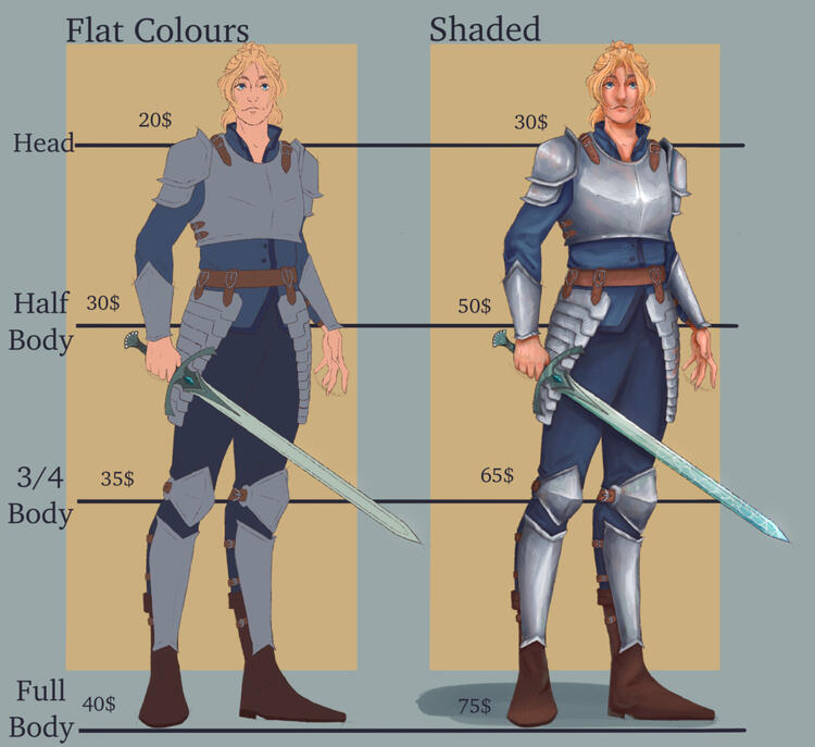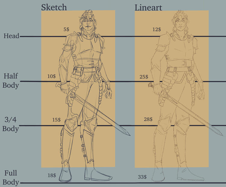-I will only accept a limited amount of commissions at a time--I will contact you before I begin the commission and send and invoice for 25% price upfront depending on the requested complexity and style--Depending on the requested style, expect to receive updates for each step completed (Sketch, Lineart, Flat Colours, Shading)--Each commission takes between a week and six weeks to complete depending on complexity--You may request alterations (small ones only once shaded). You may be charged an extra 10$ fee for any complicated alteration requested on an aspect that has already been approved of by you at a pervious update--Include references! (poses you like, sketches, inspiration etc…) especially if the character or costume is complicated--You may not, under any circumstances, use my art for AI training, NFTs, commercial use or claim it as your own. You may share it on your social medias WITH CREDIT--Full refund if you cancel the commission before I begin. 50% refund if I haven’t finished the Lineart. No refunds after Lineart stage is complete--By commissioning me you accept that I am allowed to post the piece on my platforms unless explicitly stated otherwise-